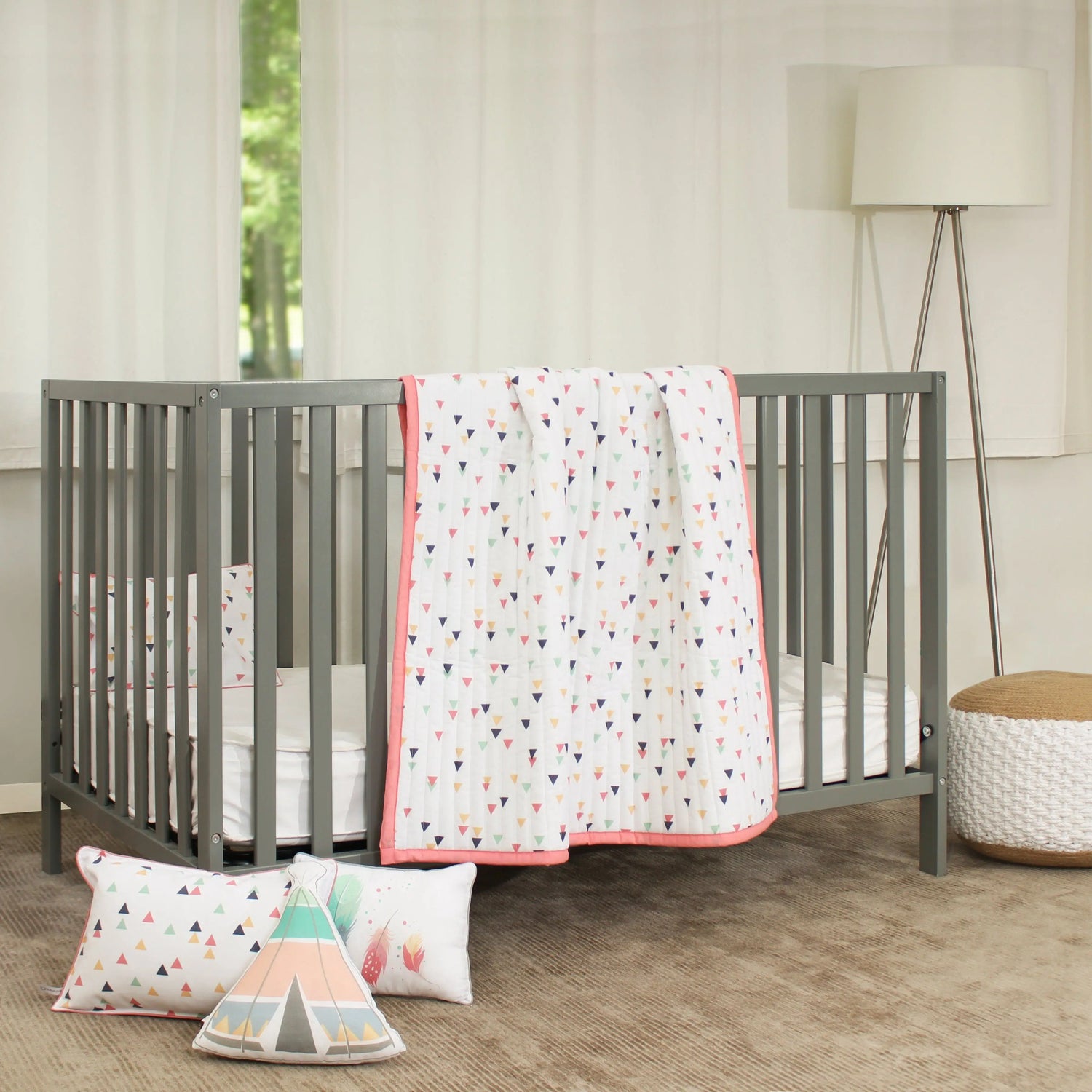 Little dreamers will love this reversible quilt. Featuring a geometric design in fun colors on one side and a dreamcatcher on the other side, this quilt is whimsical and cool. Made of cotton that's smooth to the touch and gentle on the skin. A quilt that instantly adds pop to a bed or tepee for imaginative play and restful dreaming.