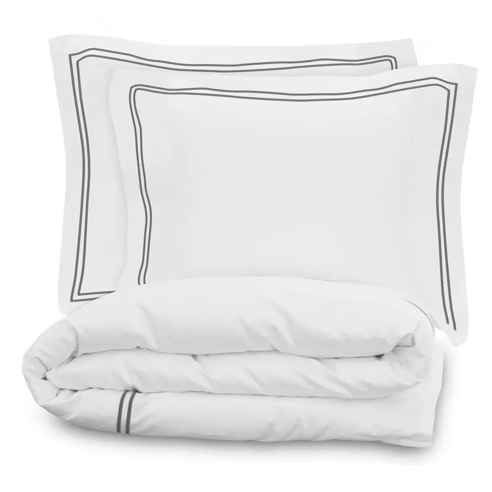 Contemporary, versatile a silky soft duvet set with a bit of crisp for beautiful drape. White cotton with an embroidered grey double- stripe border. Give your bedroom a luxury-hotel look, perfect for masters bedroom or guest room for an instant makeover.