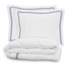 Contemporary, versatile a silky soft duvet set with a bit of crisp for beautiful drape. White cotton with an embroidered blue double- stripe border.