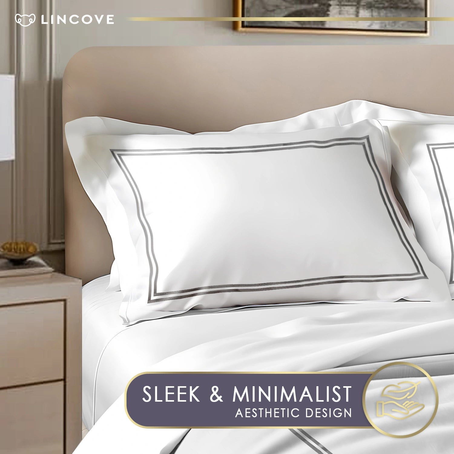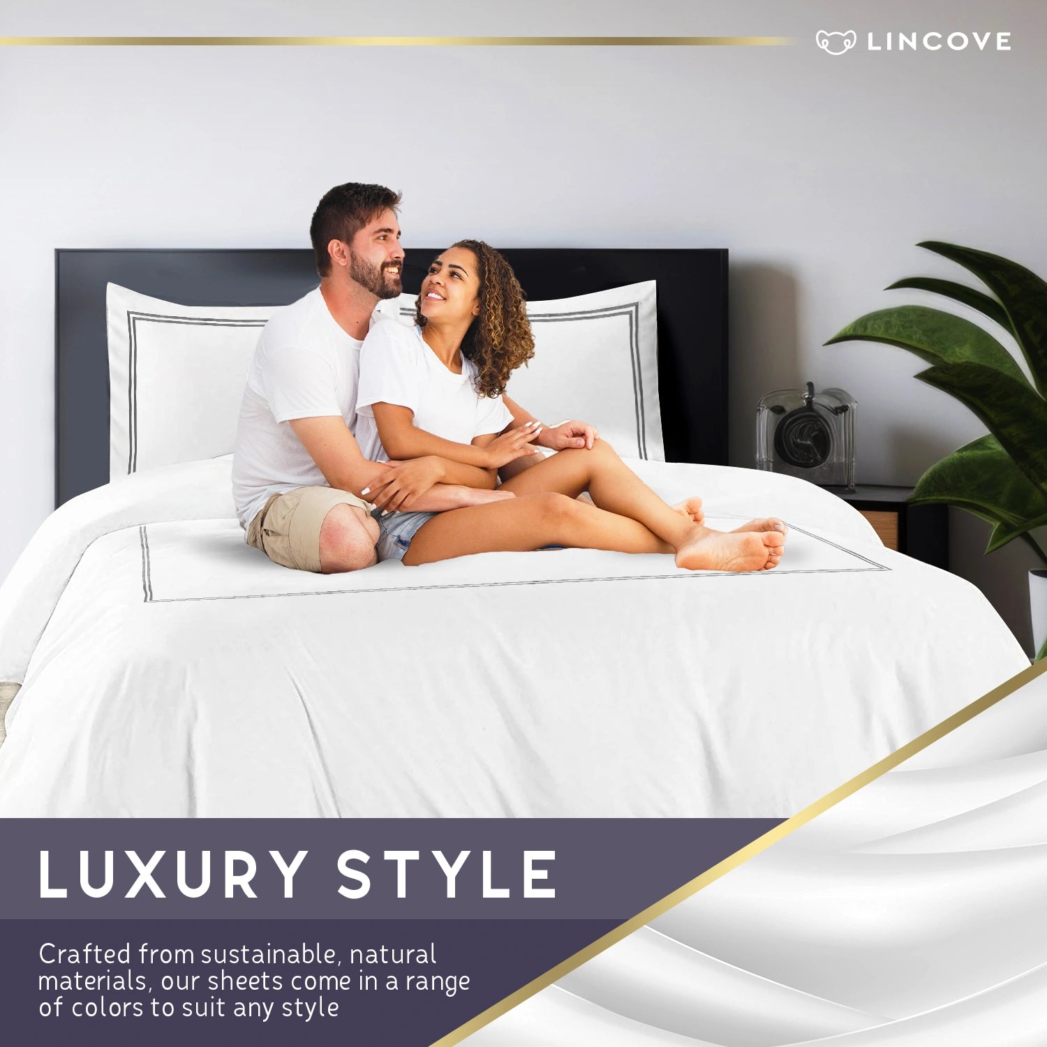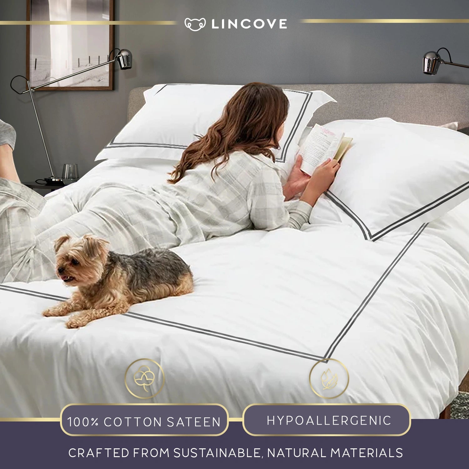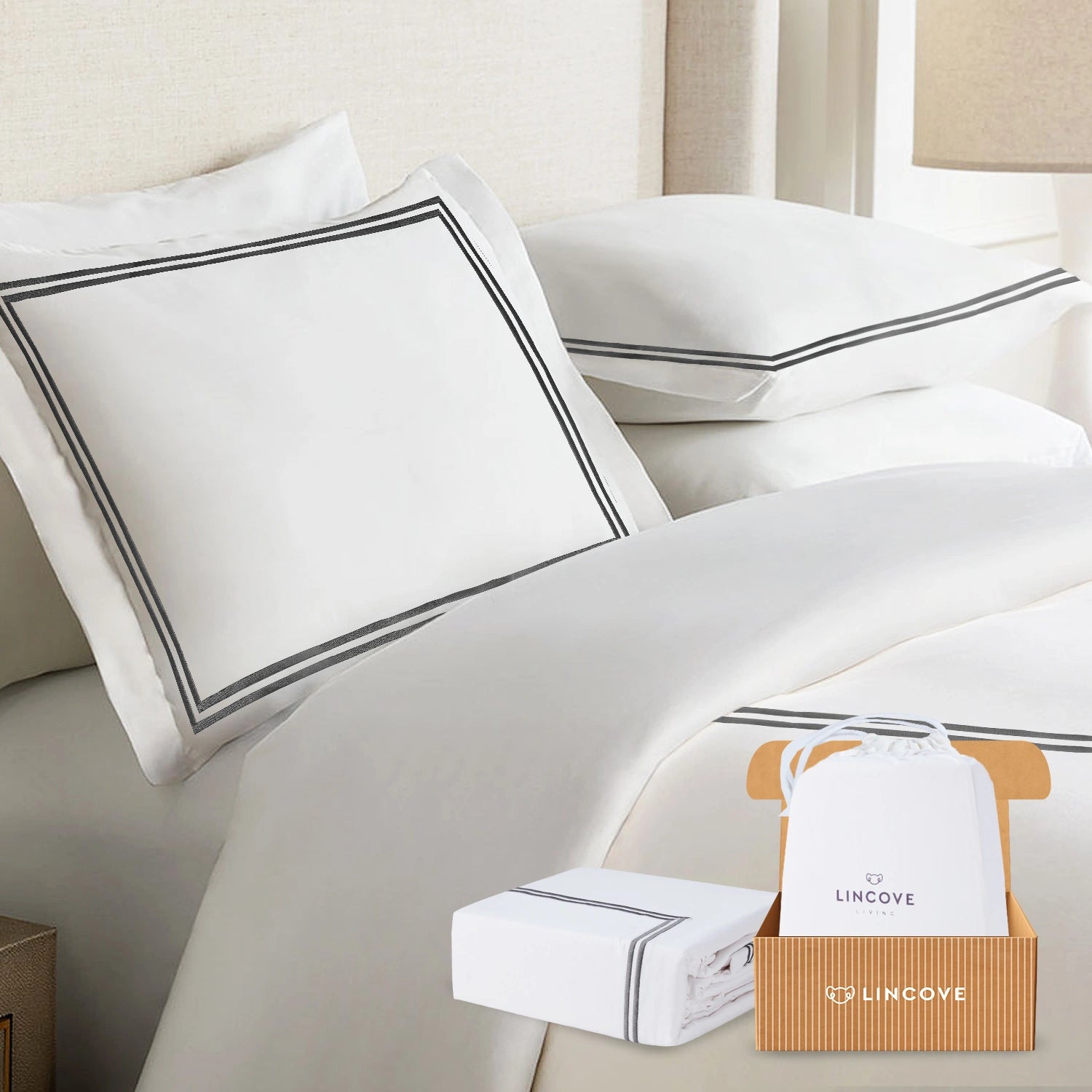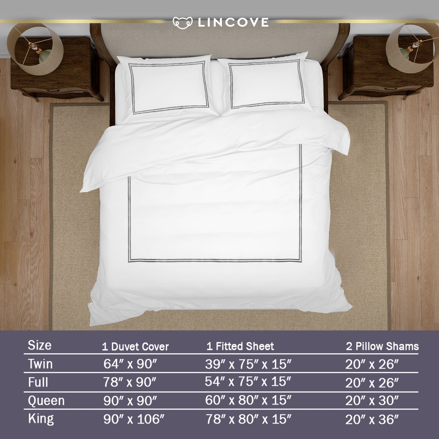 This Lincove duvet cover set has a luxurious feel, and attention to detail, aiming to provide a comfortable and indulgent sleeping experience reminiscent of a luxury hotel stay. The set includes one duvet cover one fitted sheet, and two pillow shams.